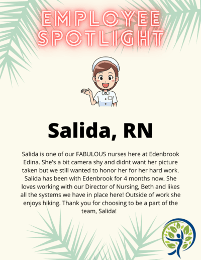 We are in a people helping people industry; passionate care requires passionate people. At Edenbrook Edina we are not just looking for caregivers, we are looking for compassionate healthcare professionals who are dedicated to making a difference in people lives.